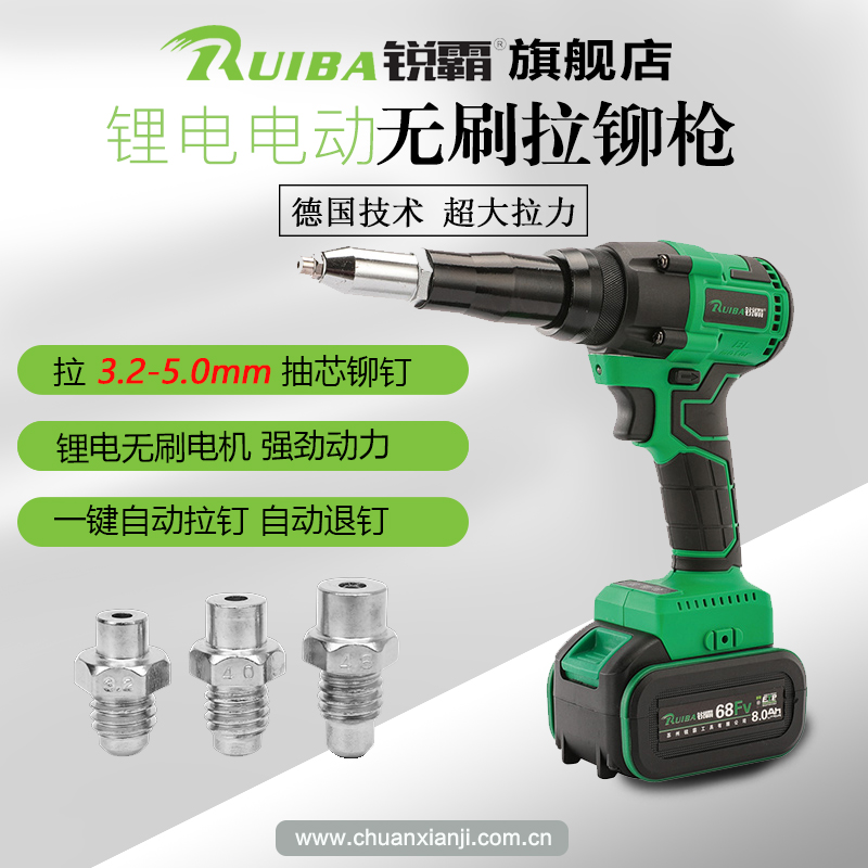 ■锂电无刷电机,工作方便,使用寿命长■铆接效率高,是旧式手动铆钉机的3 -4倍■全自动铆接,无需正反键■一键单手式操作,告别繁琐式操作■超大容量电池包,为您的工作提供保驾护航