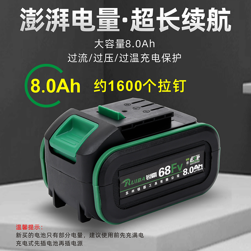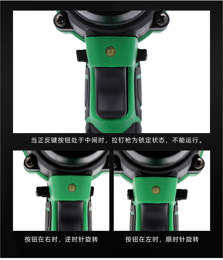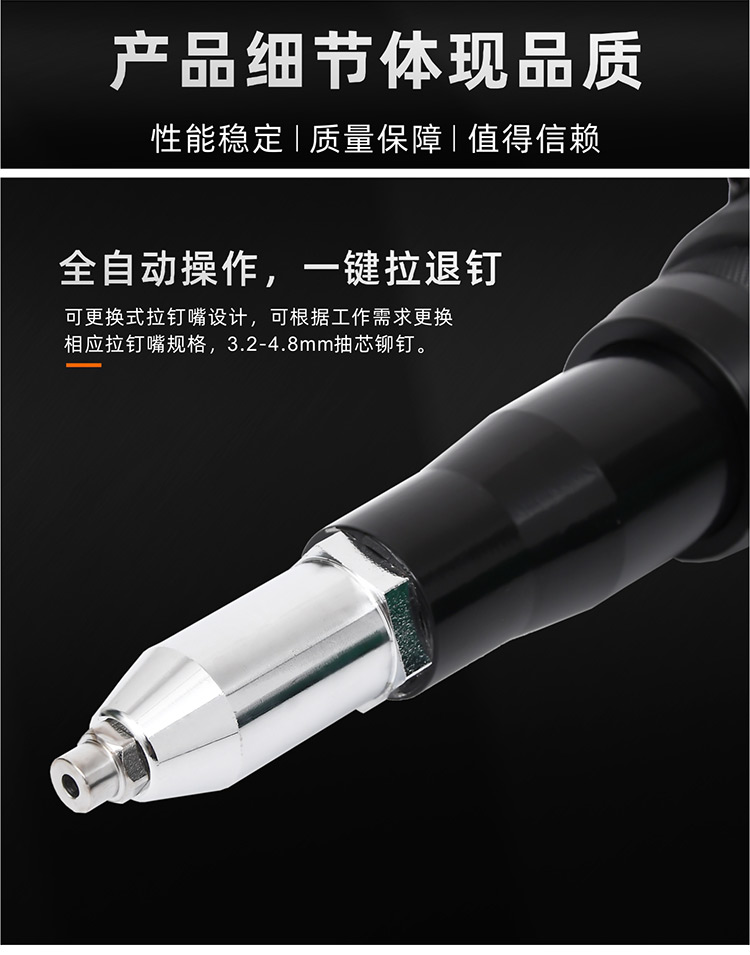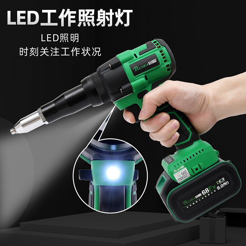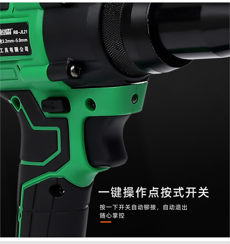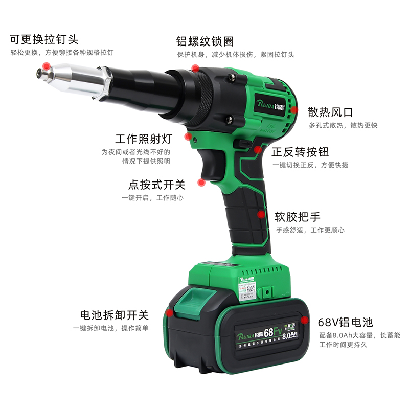 ■锂电无刷电机,工作方便,使用寿命长■铆接效率高,是旧式手动铆钉机的3 -4倍■全自动铆接,无需正反键■一键单手式操作,告别繁琐式操作■超大容量电池包,为您的工作提供保驾护航