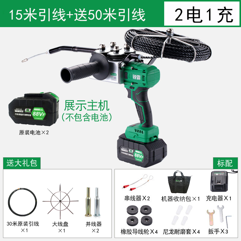 目前我们的电动穿线器分为单电单充和双电单充,标准配置15米塑钢引线,20米小线盘,2支束线器,4个穿线器耐磨套,4个胶轮压片,1个安装工具包,1个穿线器收纳包,也可根据客户需求选择高配30米塑钢引线,30米大线盘,50米塑钢引线,目前凡是通过我们官网订购所有穿线机,均可免费赠送1支3线2.5-4平方通用型并线器或者1支5线2.5-4平方通用型并线器。